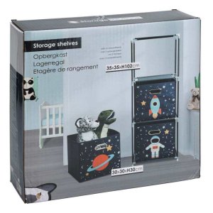zásuvková skříňka se 3 přihrádkami, kovový rám s netkanou textilií 80gsm modré barvy s policemi, rozměry: 35x35xh102cm, tloušťka trubek: 95mm, modrá barva rámu, se 3 netkanými úložnými boxy v designu dětského prostoru a kovovou rukojetí