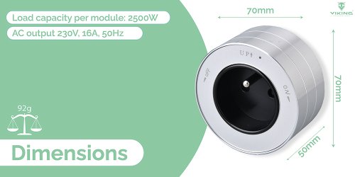 Technické specifikace: Model: Zásuvkový modul Viking A30 Přípojkový konektor vstup: 230V, 16A ,50Hz Zátěžový výkon na jeden modul: 2500W AC výstup: 230V, 16A, 50Hz Rozměry: 7 cm x 7 cm x 5 cm Hmotnost: 92g