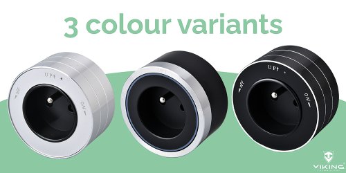 Zásuvkový modul Viking A30 je vybaven AC výstupem 230 V (16 A, 50 Hz) a je k dispozici ve třech barevných variantách.