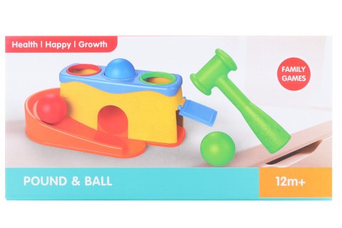 Plastová zatloukačka s dráhou o rozměru cca 27 x 13 x 10,5 cm se třemi míčky a kladívkem. Rozměr balení cca 27,5 x 14 x 11 cm. Věk 1+