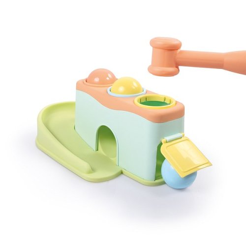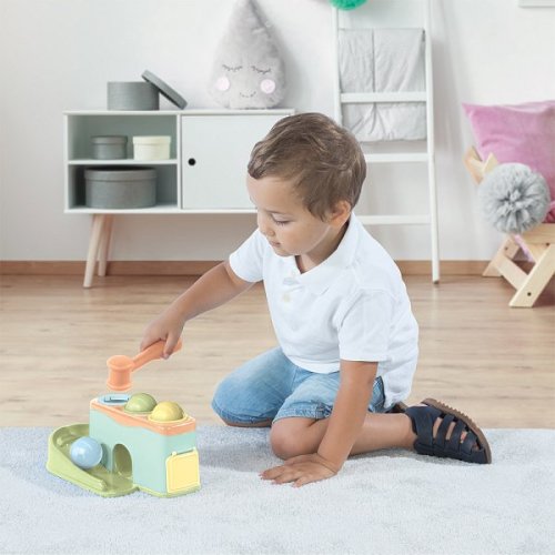 Zatloukací hračka s míčky Rolling balls pomáhá dětem rozeznávat barvy a tvary. Hračka rozvíjí jemnou motoriku, představivost a logické myšlení. Děti mohou umístit barevné kuličky do otvorů, zatlouci je kladívkem a pak sledovat odkud se kulička vykutálí. Každý vstupní otvor má vlastní východ pro kuličku. Každý otvor má odlišný barevný vstup což dětem pomáhá učit se rozlišování barev a párovat je s barevnými kuličkami. Součástí je plastové kladívko. Hračka v krásném designu a pastelových barvách, vaše děti zabaví na dlouhé chvíle. Vyrobeno z kvalitního plastu. Vhodné pro děti od 12 měsíců. Rozměry hračky: 10,6 x 26 x 13,7 cm. Rozměry balení: 11 x 27 x 14 cm.