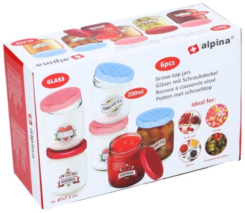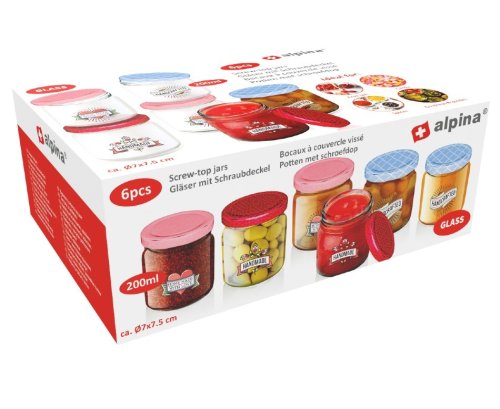 Zavařovací sklenice s víčkem Alpina – sada 6 ks, 200 ml Praktické a krásné šroubovací dózy, které najdou využití v každé domácnosti. Ideální pro zavařování džemů, uchovávání omáček, koření, sušeného ovoce nebo sladkostí.