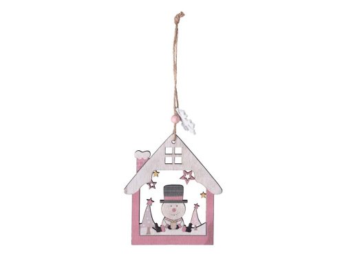 Závěs dřevo 110x125mm domeček se sněhulákem, přírodní, růžová