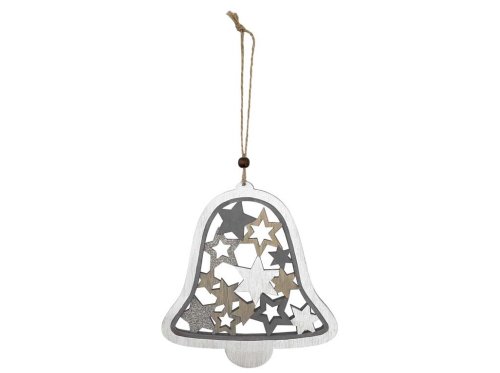 Závěs dřevo 160x170mm zvoneček s hvezdičkami, přírodní s glitrem, bílá
