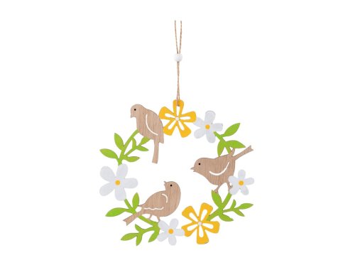 Závěs dřevo 180mm věneček květiny, ptáček přírodní, barevná