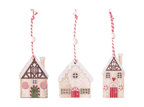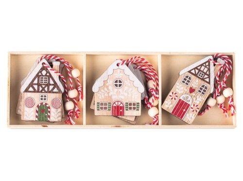 Závěs dřevo 9ks 55x75mm domečky v krabičce,přírodní, barevná