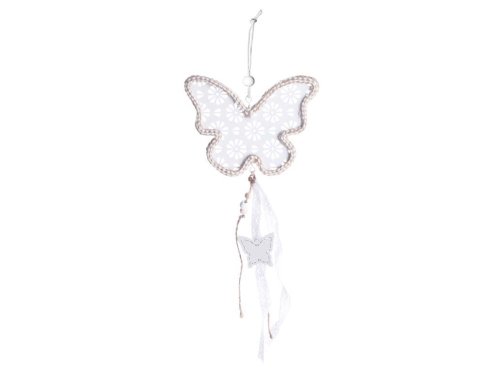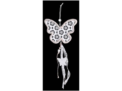 Kovový závěs ve tvaru motýlka, ideální pro dekorace na okna nebo stěny. Jeho rozměry jsou 100 mm.