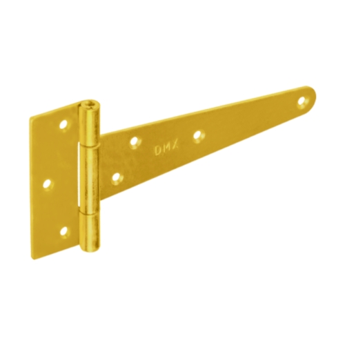 Kloubový stavební závěs brankový dekorativní. Materiál pozinkovaná ocel žlutá. Délka 150 + 35 mm, výška 80 mm, síla materiálu 2 mm, otvory 7 x 4 mm. EAN 5907708131034