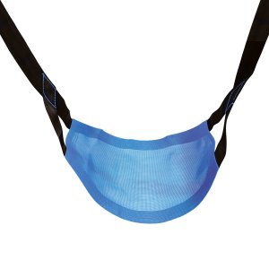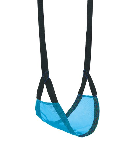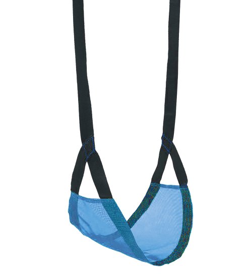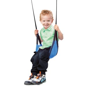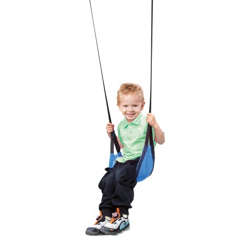 Dětská modrá houpačka, vyrobená z nylonových a polyesterových vláken. Houpačka je prodyšná neklouzavá a odolná. Je skladná a snadno se přenáší. Kovová spona umožňuje přizpůsobení délky lana podle velikosti dítěte.