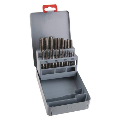 Sada 21ks závitníků o velikostech M3 / 4 / 5 / 6 / 8 / 10 / 12. Sada v plastovém boxu. Norma DIN 352. EAN 8590804028154