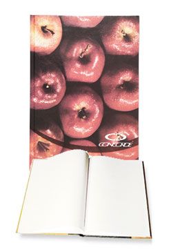 Linkovaná záznamní kniha v laminovaných deskách. Bělený papír, lepená vazba.