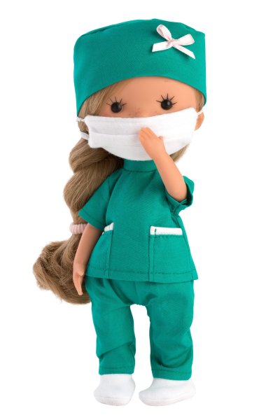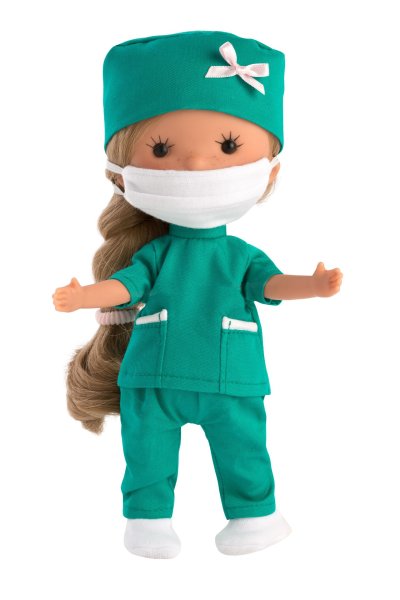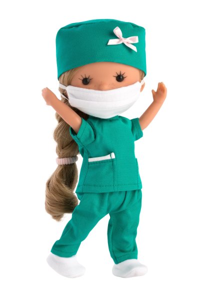 Panenka bez zvuku s vinylovým tělem a vlásky po celé hlavě. Ruce a nohy jsou k tělu přichyceny kloubem. Panenka je polohovací a může i sedět. Velikost panenky 26 cm. Ručně vyrobeno ve Španělsku, baleno v dárkové krabici ve tvaru kornoutku. Doporučený věk od 3 let.