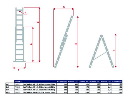 max. výsuvná délka: 4,255 m šířka: 470 mm hmotnost: 9,2 kg počet příček: 3 x 7