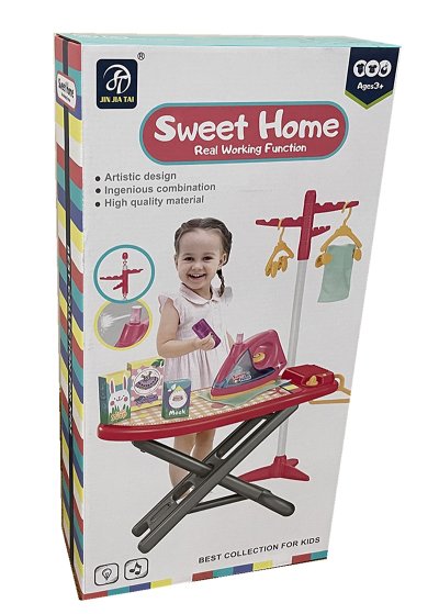 Plastové žehlící prkno s žehličkou, věšákem, ramínky a dalším příslušenstvím pro malé hospodyňky. Výška prkna 50 cm. Žehlička má zvukové a světelné efekty.
