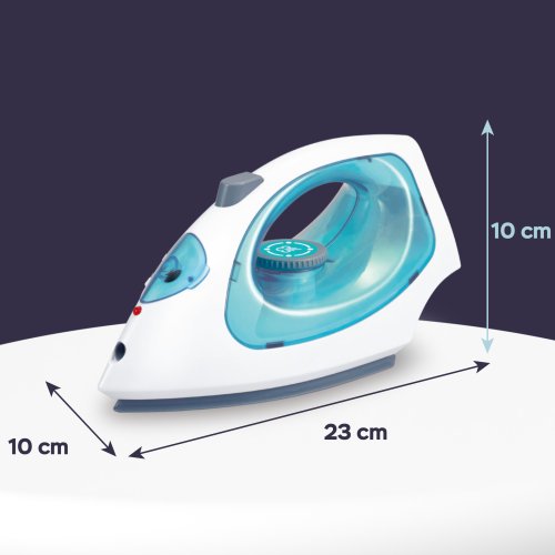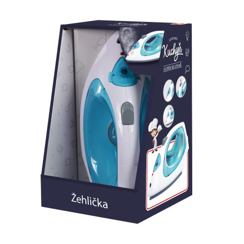 Plastová žehlička bílo-tyrkysové barvy s kterou budeš mít šatičky pro své panenky vždy perfektně vyžehlené! Doplň vodu do žehličky (pomocí láhvičky v balení), při stisknutí tlačítla žehlička vydává zvuk, svítí a vypouští páru. Funguje na 3 ks baterií typu AA, které nejsou součástí balení.