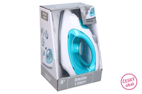 Žehlička s efekty. Velikost 22 cm. Světelné a zvukové efekty. 3xAA baterie nejsou součástí. Lze naplnit vodou, upouští páru po stlačení tlačítka.