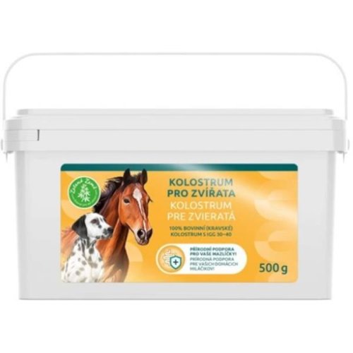 Kolostrum Zelená země posiluje imunitu, zlepšuje trávení a podporuje regeneraci u psů, koček, drobných savců, koní, skotu, koz, ovcí a prasat všech plemen a věkových kategorií. Kolostrum, označované též jako mlezivo, je takzvané prvotní mléko u savců. Tvoří se v mléčné žláze těsně před porodem a je produkováno asi 3–5 dní po něm. Složením se kolostrum významně liší od zralého mléka. Rozdíly ve složení mleziva se postupně mění a z nezralého mléka se stává mléko zralé. Je nenahraditelným zdrojem imunoglobulinů, bílkovin, vitamínů a minerálů. Kolostrum je vhodné pro zvířata jako náhrada mateřského mléka pro novorozená mláďata, při rekonvalescenci po nemoci nebo veterinárním zákroku nebo při oslabení imunity, dále jako podpora v období stresu a fyzické zátěže či pomoc při zánětech a bakteriálních infekcích. Hlavní přednosti:
