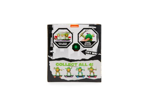 The Teenage Mutant Ninja Turtles jsou cca 13 cm velké želvy na skatech připraveny na boj. Mají typický design oblíbených želv Ninja, které drží svoji ikonickou zbraň. Zatáhněte želvu Ninja dozadu, pusťte ji a sledujte, jak jezdí! Stisknutím tlačítka na krunýři spustíte bojový režim! Nasbírejte všechny 4 postavy - Leonardo, Michelangelo, Donatello a Raphaelo! Vhodné pro děti od 3 let.