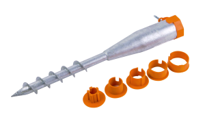 Žárově zinkovaný šroubovací vrut na plotové sloupky, s plastovými redukcemi na kulatinu pro různé průměry. Součástí vrutu je šroub se závitem pro upevnění slopku. 5 redukcí (průměr 24 mm, 35 mm, 40 mm, 48 mm, 55 mm).