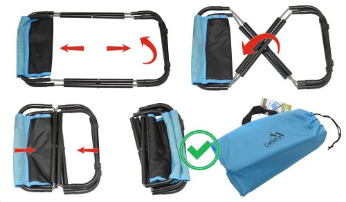 Díky svým malým rozměrům 33 x 18 x 8 cm je židle snadno přenosná (po rozložení 28 x 38 x 30 cm). Maximální možná nosnost je 90 kg.