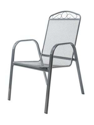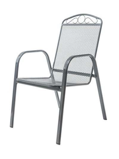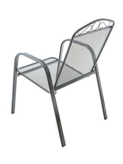 Ocelová zahradní židle s opěrkou, zakončenou vkusným dekorem, se hodí zejména do zahrad a na terasy domů.