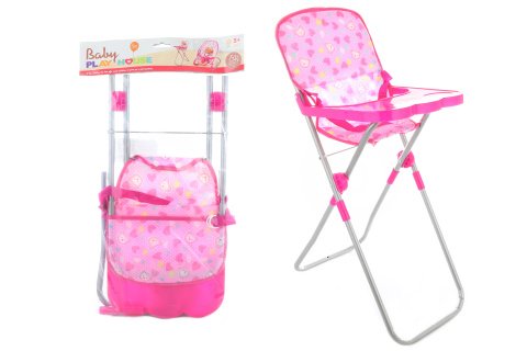 Plastová jídelní židlička pro panenku. Židlička má kovové nohy. Baleno v igelitovém sáčku. Velikost židličky cca 61 x 35 x 23 cm. Rozměr balení cca 31 x 55 cm. Věk 3+