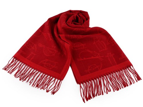 Zimní šála / pléd s třásněmi, kočky 65x180 cm - červená