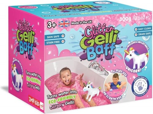 150g Gelli (16 balíčků), třpytky v růžové barvě, 150g čističe odpadů, 30cm nafukovacího jednorožce.