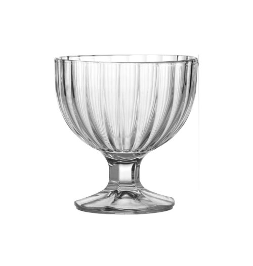 Zdobená miska na zmrzlinu vyrobená ze skla o objemu 270 ml, průměr 99 mm a výška 103 mm. Cena za sadu 6ks. EAN 3800864005404