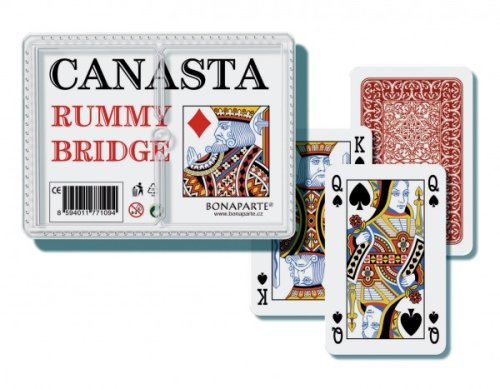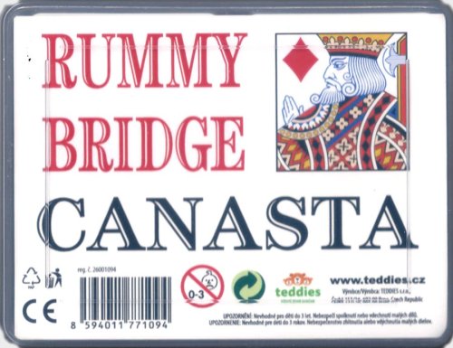 Canasta je velice známá společenská hra, oblíbená napříč generacemi.Karty hrají rády děti, rodiče i prarodiče. Karty jsou skladné a vejdou se do každého batůžku či cestovní tašky. Na dovolené prší? Nevadí, zahrajte si karty a hned budete mít lepší náladu. Karty jsou uložené v uzavíratelné plastové krabičce. Rozměry balení 13 x 10 x 2 cm. Vhodné pro děti od 3 let.