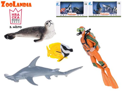 Sestav si své vlastní akvárium s plastovými figurkami z kolekce Zoolandia, ideální na hry plné fantazie. Balení obsahuje figurku potápěč se žralokem a doplňky. Dostupné jsou 3 druhy - žralok bílý, žralok tygří, kladivoun. Vhodné pro děti od 3 let.