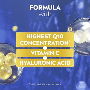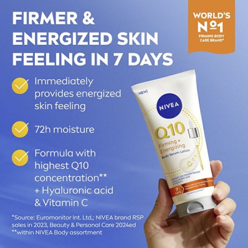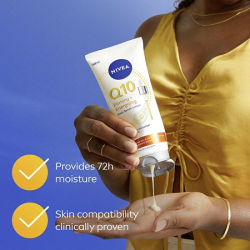 Toto inovativní sérum spojuje intenzivní účinnost séra s hydratační péčí tělového mléka. Obsahuje nejvyšší koncentraci koenzymu Q10 v rámci tělové kosmetiky Nivea, která podporuje tvorbu kolagenu a zároveň chrání pokožku před oxidačním stresem. Spolu s vitaminem C a kyselinou hyaluronovou viditelně zlepšuje vzhled pokožky a dodává jí zdravý jas a dlouhodobou hydrataci. Pokožka je pevnější a zářivější už za 7 dní.