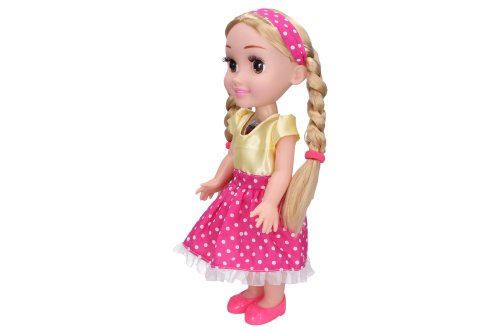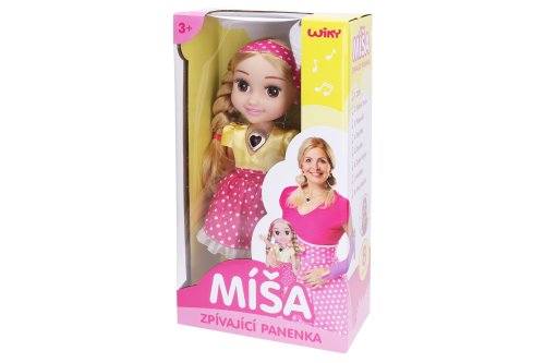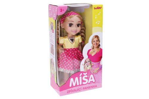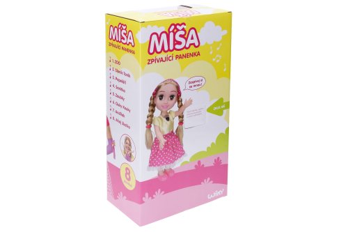 Zpívající panenka Míša Růžičková. Velikost 33 cm. Světelné a zvukové efekty. Aktivace písniček stlačením srdíčka na hrudi. 3xAAA baterie součástí. Přepínač vypnuto, nízká hlasitost, vysoká hlasitost. Písničky - ZOO, Sloník Toník, Popeláři, Sanitka, Zoubky, Ouky Kouky, Andílek, Ahoj školko.