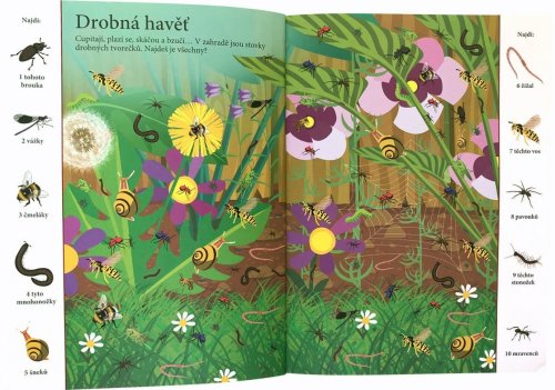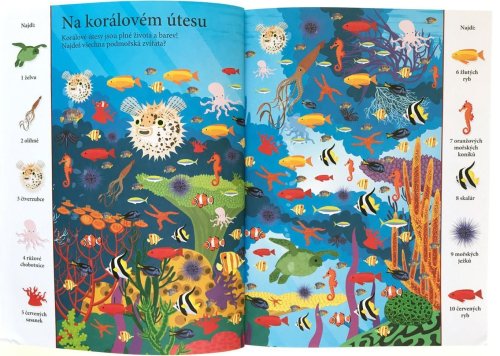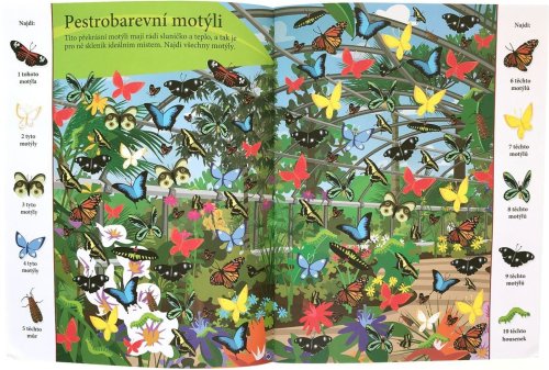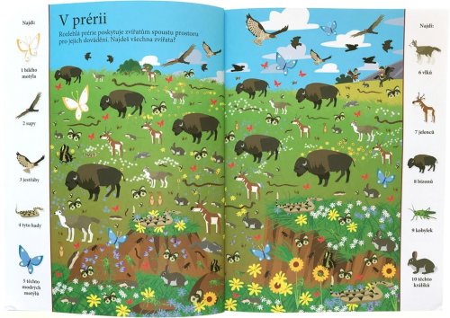 Najdi více než 1000 zvířat schovaných v obrázcích. Procvičuj své smysly nad rozmanitými výjevy zvířat z celého světa. Najdeš jednoho chameleona, dvě žirafy, tři netopýry a čtyři labutě? Dnes je u řeky velmi rušno a velký hluk se ozývá také z farmy, tak neváhej a pusť se do důkladného prozkoumávání obrázků. V tomto sešitu tě čeká mnoho výjevů z nejrůznějších krajin plných zajímavých tvorů. Schválně, jak bystré máš smysly? Najdeš všechna zvířata schovaná v obrázcích? Na poušti, v deštném lese, pod hladinou, pod zemí, v oceánech nebo v australské divočině. Objevuj rozmanité výjevy a zabav se hledáním více než tisícovky zvířat, která jsou v knize šikovně ukryta. Kolik z nich se ti podaří najít?