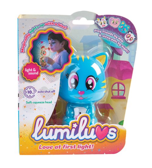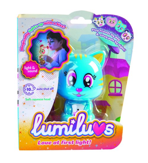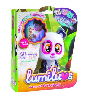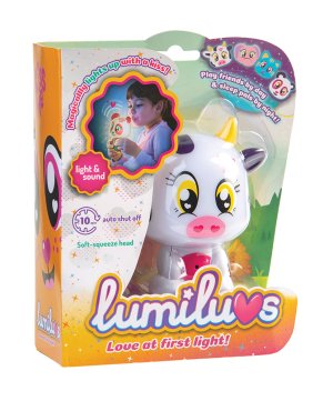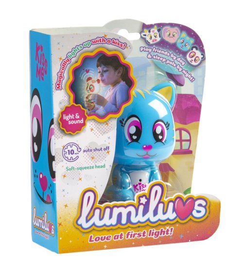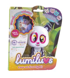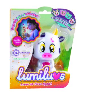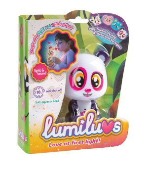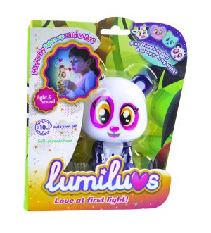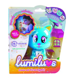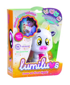 Zvířátko Lumiluvs po fouknutí na bříško a pusinku svítí a brblá. Výrobek vyžaduje 3× LR44 baterie, které jsou součástí balení.