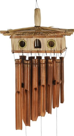 zvonkohra bambusová (gigantochloa apus lakovaná) s ptačí budkou (imperata cylindrica lakovaná), rozměr ptačí budky 30x12xh17cm, včetně 12 zvonkoher, celková délka včetně lana je 80cm