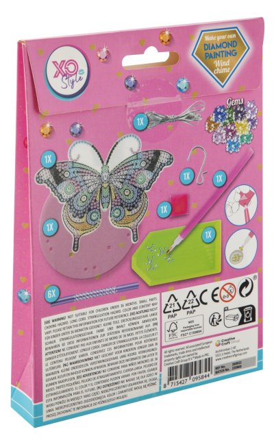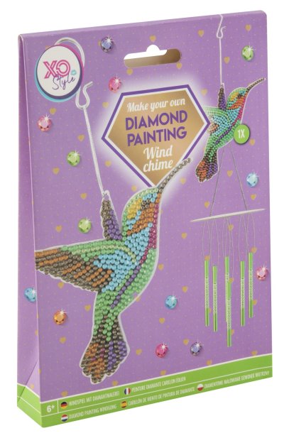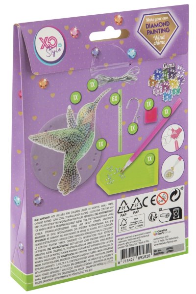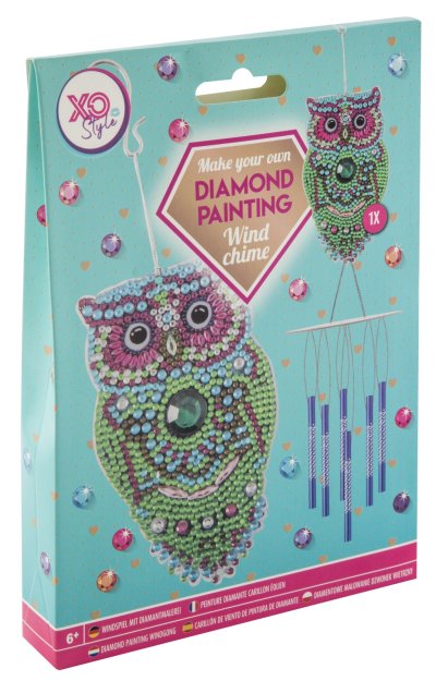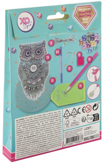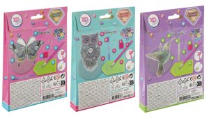 Zvonkohra s kamínky diamond – obsahuje 1× přívěsek, diamanty, 1 pero na aplikaci, 1 kalíšek na vysypání, 1 vosk, příslušenství ke zvonkohře. Ve třech provedeních sova, kolibřík a motýl.
