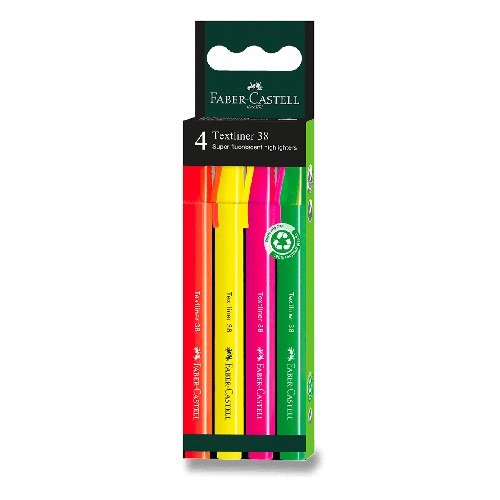 Souprava 4 kusů kvalitních superfluorescenčních zvýrazňovačů Faber-Castell Textliner 38. Šíře stopy 1 a 4 mm.