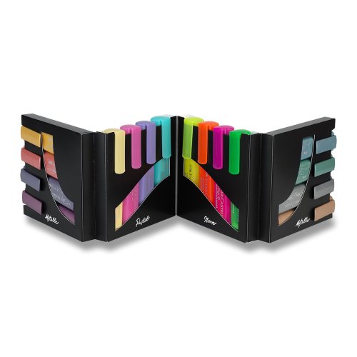 Stolní souprava 16 zvýrazňovačů Faber-Castell Textliner 46 v netradičních neonových 4x, pastelových 4x  a metalických odstínech 8x.