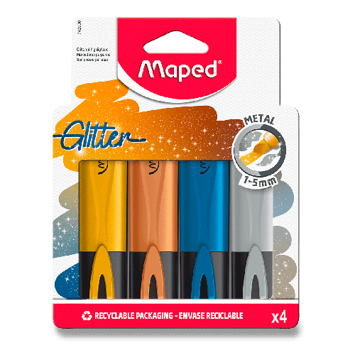 Plochý zvýrazňovač Maped Fluo Peps Glitter Metal ve čtyřech metalických barvách se třpytivými efekty.