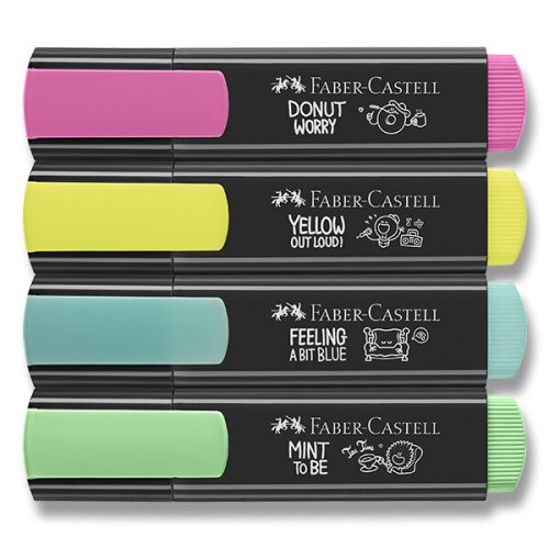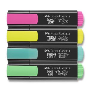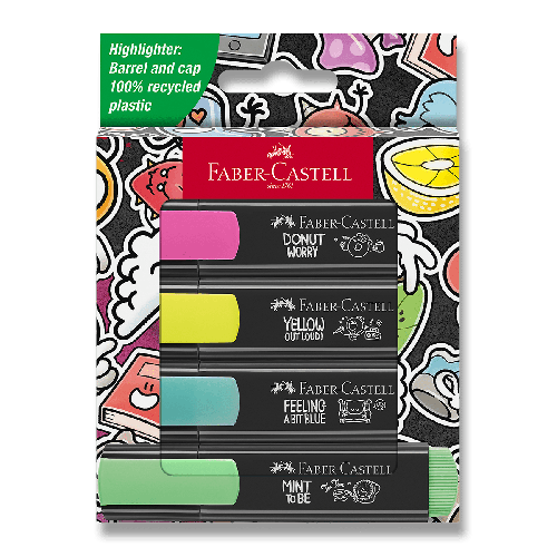 Sada plochých zvýrazňovačů Faber-Castell Textliner 46 ve 4 odstínech v moderním graffiti designu.