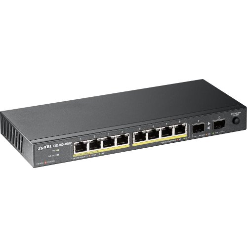 8 portů RJ-45 s rychlostí 1 Gbps 2 porty SFP s rychlostí 1 Gbps PoE napájení až 130W