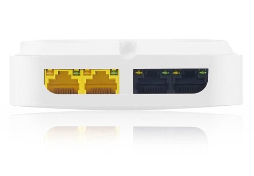 Zařízení nabízí 1× uplink port 802.3at PoE+ pro napájení a 3× downlink gigabitové porty, přičemž jeden z nich funguje jako PoE PSE port s výkonem 5 W pro napájení dalších zařízení jako VoIP telefony nebo IP kamery. Univerzální design umožňuje montáž přímo na zásuvkovou krabici, na stěnu nebo na stůl pomocí volitelného stojánku.